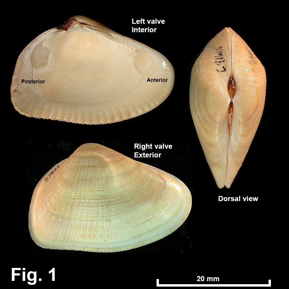 Hemidonax pictus (Tryon, 1870) Description: Shape elongate, length much greater than height, umbo posterior to midline, anterior side longer; weak diagonal ridge from umbo to ventral margin, ventral margin with shallow indentation near posterior end. Exterior with smooth anterior half and broad radial ridges with narrow interspaces on central section and posterior end. Interior with strong anterior and posterior muscle scars and pallial line distinct (but no pallial sinus); margin coarsely crenulate. Hinge as for family. Ligament external. Shell exterior colour white to brown with brown to purple radial or zig-zag markings; interior white, sometimes with purple blotches. Size: Up to 48 mm in length. Distribution: Annan River mouth, north Qld, southwards to Bindalong, south of Ulladulla, NSW. Habitat: All the specimens in the Australian Museum collection are from beach washup or intertidal sand flats. Comparison: This species is similar to Hemidonax dactylus but is larger with a heavier shell, and the posterior ridge from umbo to ventral margin is sharper, and there is an indentation in the ventral margin near the posterior end. Fig. 1: Woy Woy, NSW (C.074269) |