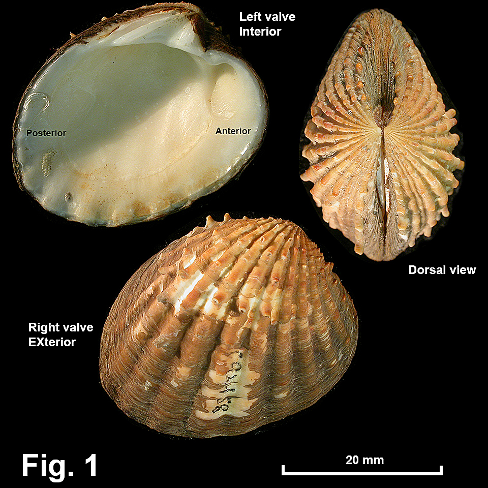 Bathycardita raouli (Angas, 1872) Descrition: Shell solid and heavy, well inflated. Shape umbo located well in front of midline; anterior dorsal margin short, straight; posterior dorsal margin long, convex. Lunule small, deep. Exterior with about 13 sparsely scaled radial ribs, interspaces about the same as rib width. Interior with external ribs showing through; muscle scars incised, pallial line continuous; margin coarsely crenulate. Hinge strong; left valve with bifid cardinal tooth and long, blade-shaped lateral. Right valve with 2 cardinals and slotted lateral. Ligament long, external. Shell colour white or pink with pink radials, covered by thick, brown periostracum. Interior pale fawn. Size: Up to 37 mm in length. Distribution: Endemic to Australia: Evans Head, NSW, southwards to Bass Strait and eastern Tas. Habitat: Subtidal, 50-150 m depth. Fig. 1: Evans Head, NSW (C.094158) |