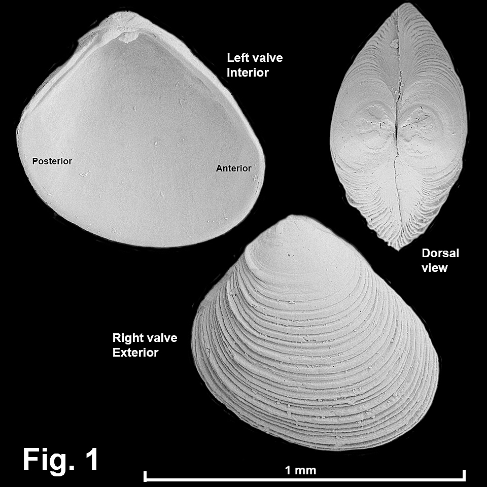 Condylocuna tricosa Middelfart, 2002 Description: Shell minute. Prodissoconch relatively large, low, dome-shaped, with radiating indentations then smooth, with sharp rim. Shape extended anteriorly, umbo behind midline, anterior and posterior dorsal margins straight or concave, ventral margin smoothly rounded. Lunule and escutcheon long and broad. Exterior with up to 24 commarginal ribs below prodissoconch, these being irregular and crowded ventrally. Interior smooth, margin smooth. Hinge strong. Ligament internal. Shell translucent or opaque white. Size: Up to 0.9 mm in length. Distribution: Sparse records from Heron Island, Qld southwards and around southern Australia, to Cape Donnington, SA. Habitat: Known from beach washup and down to 103 m depth. There are only 7 lots in the AMS collection, implying it is a rare species. Comparison: This species has a relatively large, smooth prodissoconch, and the shell’s inner margin is not denticulate. Fig. 1: Interior and dorsal view HOLOTYPE C.388198. Exterior view C.380338. All Heron Island, Qld. |