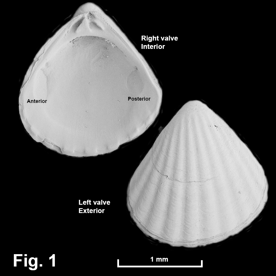 Cuna libbyae Middelfart, 2002 Description: Shell minute. Prodissoconch relatively small, dome-shaped, rim thickened. Shape triangular, umbo on midline, anterodorsal margin convex, posterodorsal margin weakly convex. Escutcheon wide, lunule narrower. Exterior with 10-11 broad, flat radial ribs. Interior with muscle scars well-defined, margin with 8-9 squared denticles. Hinge strong. Ligament internal. Shell translucent to opaque white. Size: Up to 1.8 mm in length. Distribution: Known from SE of Swain Reefs, Qld, southwards to off Sydney, NSW. Habitat: Records from 115-1465 m depth. The AMS collection holds 16 lots of this deep-water species, suggesting it is common in its habitat. Comparison: Within the genus Cuna this species is characterised by the low, radial ribs. Fig. 1: Exterior: Off Sydney, NSW (C.406268 HOLOTYPE). Interior: Off Sydney (PARATYPE C.387700). SEM images Peter Middelfart, Australian Museum. |