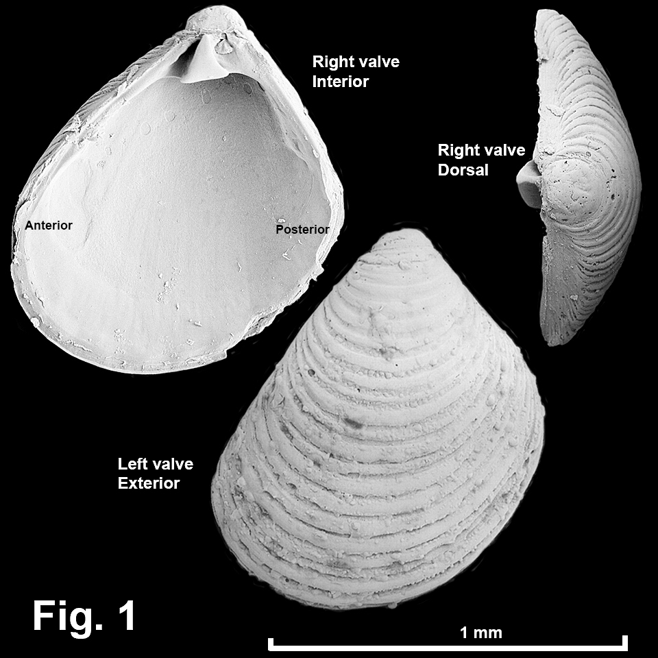 Warrana minuta (Laseron, 1953) Description: Shell minute. Prodissoconch relatively large, domed, smooth with thickened rim. Shape triangular dorsally, semicircular ventrally, higher than wide, umbo posterior to midline. Anterodorsal margin straight to weakly convex, posteodorsal straight to weakly concave. Escutcheon and lunule wide. Exterior with 17-19 strong, wide commarginal ribs. Interior smooth, margin smooth. Hinge strong. Ligament internal. Shell translucent to opaque white. Size: Up to 0.96 mm in length. Distribution: From Port Curtis, Qld, southwards to Cronulla, Sydney, NSW. Habitat: Known from beach washup and down to 210 m depth. The AMS collection holds hold 22 lots, suggesting this species is only moderately common. Comparison: This species is characterised by its very small size – always less than 1 mm in length – and strong, coarse commarginal ribs. Synonymy: None. Fig. 1: Interior: Off Balmoral, NSW (C.406441). Exterior: Narrabeen Beach, NSW (C.90556 SYNTYPE). Right valve dorsal: Off Balmoral, NSW (C. 406441). SEM images by Peter Middelfart, Australian Museum. |