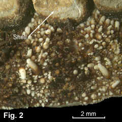 Liolophura gaimardi (Blainville, 1825) Description: Animal broadly ovate, always eroded. Median valves with sculpture usually obliterated by erosion. Girdle fairly wide, usually banded with white and dark brown or black, sculptured with pointed to blunt, straight or curved conical spines varying in length, up to 1.5 mm long. Size: Up to 61 mm in length. Distribution: Endemic to Australia: Magnetic Island, Qld, southwards to Port Hacking, NSW. Habitat: Lives on the upper surfaces of rocks, in crevices and on dead oyster shells, from high tide down to mid-tide level. In NSW, very common in the harbours but rare on the exposed open coast. In Queensland it is common on the open coast. Synonymy: Liolophura gaimardi queenslandica Pilsbry, 1894 is a previously recognised synonym. Fig. 1: Bottle and Glass Rocks, Sydney Harbour (C.394335). Fig. 2: Girdle detail. Same specimen as Fig. 1. |