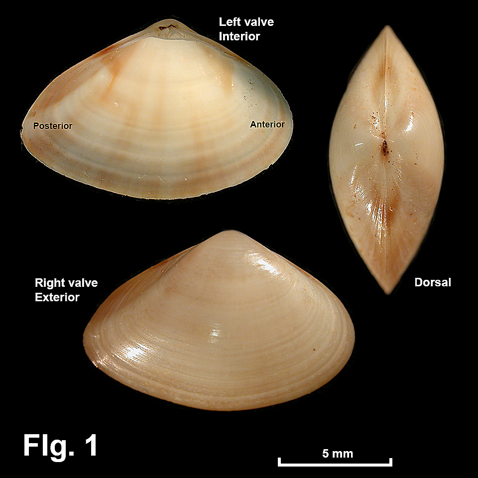 Mactra jacksonensis E.A. Smith, 1885 Description: Shell small, translucent or opaque. Shape elongate, length greater than height, umbo on or slightly anterior to midline; anterior end broadly rounded, posterior end more pointed; ridge from umbo to postero-ventral margin. Exterior smooth apart from weak commarginal growth lines. Interior white blotched with fawn, sometimes with 3 brown radial rays; usually smooth, pallial lines and muscle scars usually not evident; pallial sinus shallow (Fig. 2). Hinge as for family. Ligament internal. Shell white or fawn externally, brown radial rays sometimes visible externally but usually more obvious internally. Size: Up to 14 mm in length. Distribution: Endemic to Australia: Caloundra, Qld, southwards and around southern Australia, to southwestern WA, including Tas. Habitat: Lives in sand in the shallow subtidal zone, down to 64 m. Commonly found in beach washup. Comparison: Mactra pusilla is similar to this species, but has the umbo behind the midline. Mactra jacksonensis is further differentiated from small specimens of M. pusilla by having a shallow pallial sinus and lacking purple on the umbones and interiorly. Synonymy: Mactra matthewsi Tate 1889 is this species, described from SA. Fig. 1: Port Jackson (Sydney Harbour) NSW (C.016186) Fig. 2: Right valve interior with scars drawn in. Discoloured specimen (C.347027) |