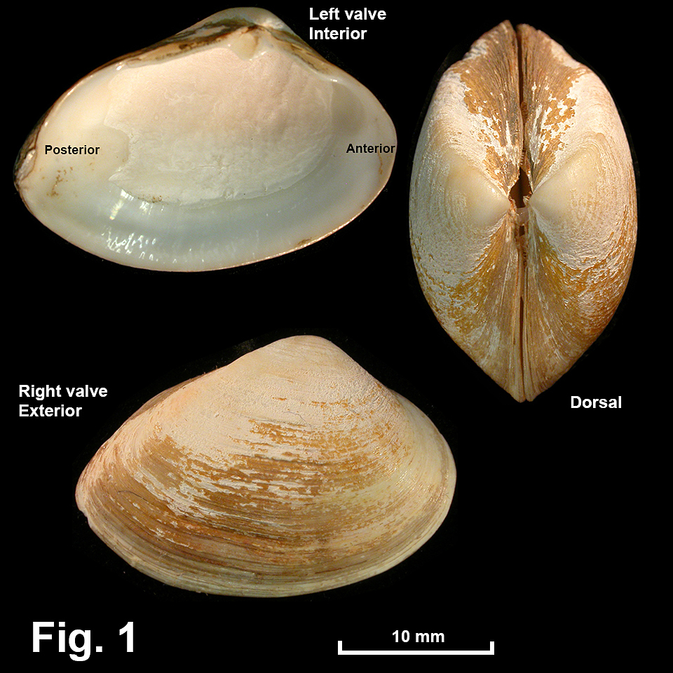 Spisula trigonella (Lamarck, 1818) Description: Shape extremely variable (as shown in Figs 1-3), some shells much longer than high (Fig. 1) whereas others are almost equal in length to height (Fig. 3). Umbo in front of midline ; ridge from umbo to postero-dorsal margin. Exterior usually eroded, sculptured only with commarginal growth lines. Interior white, muscle scars and pallial line distinct; pallial sinus shallow. Hinge (Fig. 2) Same plan as the family, but lateral teeth strongly ridged (a character of the genus Spisula). Ligament internal. Shell white, with eroded brown periostracum. Size: Up to 30 mm in length. Distribution: This species is presently considered to occur around the entire Australian coastline. It has long been recognised as common in southern Australia, but shells exactly matching southern S. trigonella (but consistently smaller) are now recognised as common in parts of northern Australia (R. Willan, pers. comm). It is a relatively recent introduction to southwestern WA, being documented as newly occurring in the Swan Estuary, Perth, by Wilson & Kendrick (1968). Genetic research is required to clarify the distribution and could reveal a species complex. Habitat: Lives burrowing in sand or mud in sheltered coastal waters and lower and middle reaches of estuaries. Synonymy: The large variation in shape has resulted in many synonyms, which are well documented elsewhere (ALA, WoRMS). Of these, the most recently used of the 19th century synonyms in NSW literature are Gnathodon parvum Petit, 1853 and Spisula cretacea Angas, 1867. More recently, Spisula colganae Healy & Lamprell, 1992 was described from the Gulf of Carpentaria, but is considered a synonym of S. trigonella by WoRMS on the assumption that S. trigonella has a pan-Australian distribution. Remarks: The life history and population biology of this species in the Hawkesbury River, NSW, was described by Jones & Murray (1988). The animal occurred living in situations of full marine salinity and upstream to salinity of 12%. Spawning usually occurred between August and November, and growth rates were highest over summer, between November and February. Fig. 1: Iron Cove Creek, Port Jackson (C.083298) Fig. 2: Hinge detail Fig. 3: a. Iron Cove Creek, Port Jackson (C.083298) b. Graving Dock, Wooloomooloo, Sydney (C.314885) |