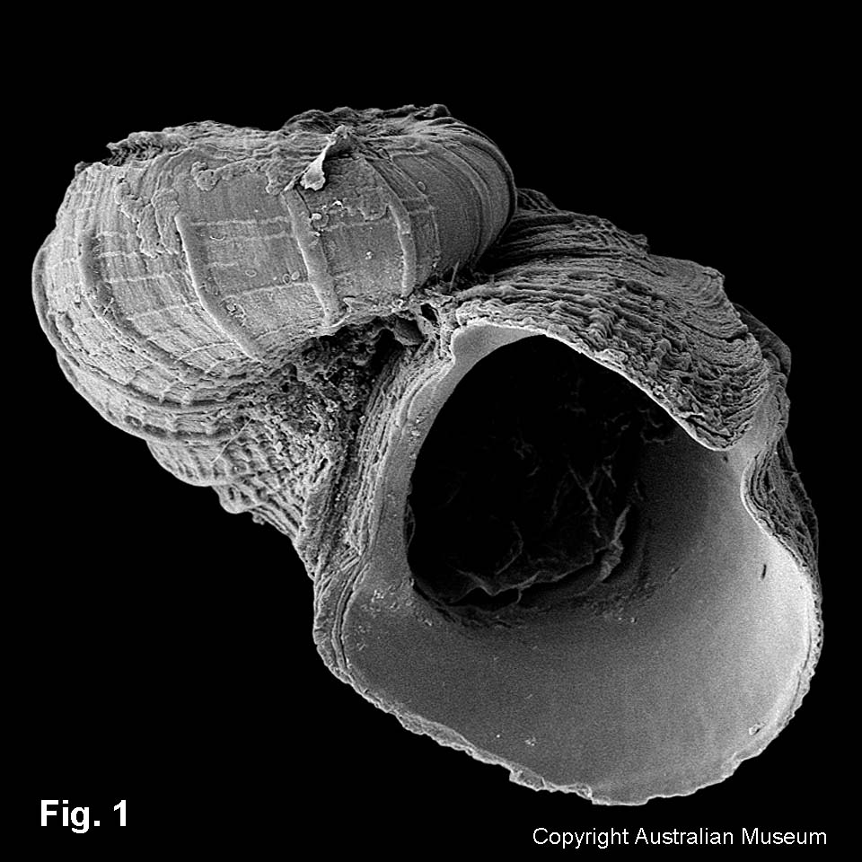 Scissurella cyprina Cotton & Godfrey, 1938 Description: Shell trochiform in shape, wider than high, spire very low, flat, or sunken, aperture large. Protoconch 1.25 whorls, with dense, strong axial threads. Last whorl with strong axial folds initially, becoming restricted to the base and fading out on last quarter; sometimes fine spiral threads above and below shoulder. Slit in margin above periphery of whorl; selenizone behind slit, with moderately raised flanges. Umbilicus deep, without bordering keel, with smooth curve from base. Operculum corneous. Shell colour white. Size: Up to 1.5 mm in height. Distribution: Endemic to Australia; Sydney, NSW, to North West Cape, WA. Habitat: Known from beach specimens, shallow water algae washings, and down to 220 m. Moderately common. Comparison: Among the NSW scissurellids, identified by the marginal slit and strong sculpture. Figs. 1,2,3 Cape Peron, 56 km S of Perth, WA, in 0-4 m (C.377559) (SEM Photos D. Geiger) |