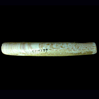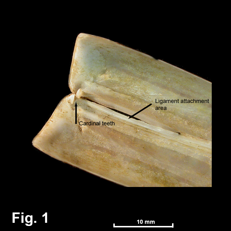 The Solenidae is a numerically small family of fairly fragile, very elongate shells which lives in soft substrates, especially seagrass beds. There are about 70 species in the family (Huber, 2010), mainly tropical and they are most common in the Indo-West Pacific region. There are about 10 species recorded from Australia, but only one from NSW. Solenids have an elongate shell form with equal shell valves that are neither flexed nor bent posteriorly. The body is compressed to fit into a long slender shell. The shell permanently gapes at both ends, with short stout siphons that are united for their entire length protruding from the posterior end; these siphons can be autotomised when an animal is under attack. An extendable foot protrudes from the anterior end. They live vertically or obliquely in the substrate in more or less permanent tubes, posterior end uppermost. They can move up and down within the tube rapidly by dilating the foot. Solenids, in common with most bivalves, are suspension feeders, filtering food particles from water they draw in via a short siphon that reaches upwards into clear water. Family Reference The Australian species were catalogued by Lamprell & Healy (1998). Coverage The only NSW species is covered here. Identification Notes Shell form Shells are long and narrow, gaping at both ends, with the ligament at the anterior end. Hinge The hinge (Fig. 1) consists of a single cardinal tooth in each valve, without any laterals. Shell interior The anterior adductor muscle scar is very long and narrow, with the posterior adductor muscle scar about half its length; both are close to the dorsal margin. The pallial line with its pallial sinus is clearly defined. Fig. 1 Interior of Solen vaginoides shell showing hinge teeth.