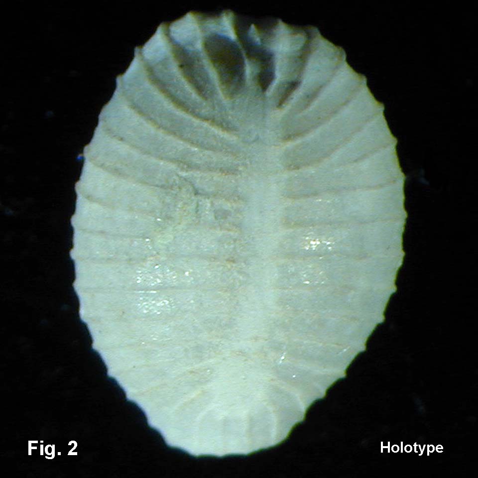 Trivia caelatura Hedley, 1918 Description: Shell thin, globular, ends not extended, aperture wide. Covered with thin ribs, 18 on the outer lip, interrupted on the dorsum. Dorsum smooth, not grooved. Fossula deep, crossed by ribs. Colour white, dorsal area more opaque than rest of shell. Size: Holotype 4.5 mm in length. Distribution: Type locality "80 fathoms off Narrabeen, NSW". Remarks: This species is known only from two specimens, both from the type locality. The shells are distinctive in the NSW fauna in having relatively few ribs, so it is surprising that additional specimens have not come to light since the species was described in 1918. Perhaps the type lot are aberrant specimens, or an unusual record of a tropical species. Figs. 1,2: HOLOTYPE Off Narrabeen, NSW, in 80 fathoms (C.025769) |