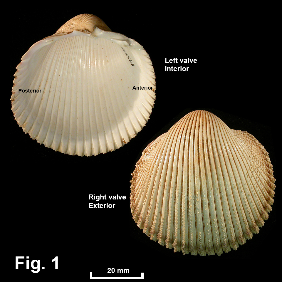 Vepricardium multispinosum (G.B. Sowerby II, 1839) Description: Shape inflated, nearly circular with projecting umbonal region. Umbo on midline; lunule and escutcheon wide, bisected by thickened marginal ridge. Exterior with 30-40 rounded, scaled ribs separated by narrower, smooth interspaces. Interior with external sculpture showing through; anterior and posterior muscle scars present, pallial line continuous but obscured by sculpture. Margin strongly crenulate, usually purple-brown. Hinge as for family. Ligament external, short. Shell fawn, sometimes with a purple-brown commarginal band ventrally. Size: Up to 75 mm in length, 76 mm in height. Distribution: Tropical Indo-West Pacific, including northern Australia. In eastern Australia, occurs in north-eastern NSW, and rarely as far south as Broken Bay. Also known as fossil shells from Sydney Harbour. Habitat: Beach washup and down to 145 m. Common. Synonymy: Vepricardium pulchricostatum Iredale, 1929 was applied to fossil specimens dredged from Sydney Harbour. Fig. 1: Tweed Heads, NSW. Trawled in 55 m (C.93878) |