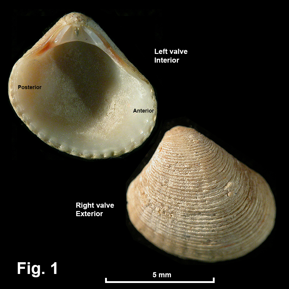 Cunanax pisum (Hedley, 1908) Description: Shell small and solid. Prodissoconch (Fig. 2) low, dome-shaped, initially pitted then smooth with sharp rim. Shape extended anteriorly, umbo behind midline, anterior and posterior dorsal margins straight or weakly concave. Lunule and escutcheon long and broad. Exterior with up to 36, strong, close, commarginal ribs, and 18-21 weaker broad, radial ribs, more developed ventrally. Interior smooth, with strongly crenulate margin. Hinge strong. Ligament internal. Shell opaque white. Size: Up to 9 mm in length. Distribution: Fraser Island, Qld, southwards to Ulladulla, NSW. Habitat: Known from beach washup and down to 201 m depth. There are 29 lots in the AMS collection, indicating this is a fairly common species. Comparison: This species is recognised by its relatively large size and presence of radial and commarginal sculpture. Synonymy: Condylocuna moringa Laseron, 1953, from off North Head, Sydney, is a previously recognised synonym. Fig. 1: 5.4 km east of North Head, Sydney (C.366513) Fig. 2: Off North Head, Sydney (C.090555 HOLOTYPE of Condylocuna moringa). SEM image Peter Middelfart, Australian Museum. |
