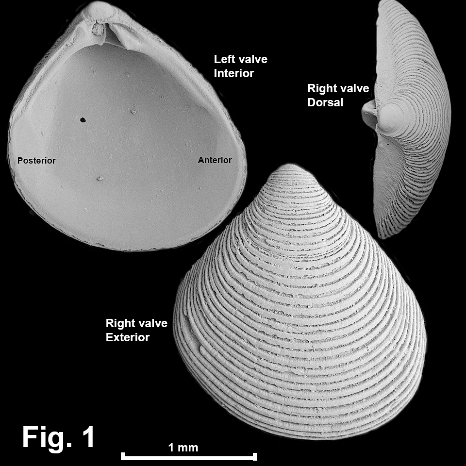 Warrana lunata Middelfart, 2002 Description: Shell minute. Prodissoconch small, domed, fairly smooth with thickened rim. Shape triangular dorsally, semicircular ventrally, higher than wide, umbo posterior to midline. Anterodorsal margin convex, posterior straight. Escutcheon wide, lunule narrower. Exterior with up to 50 strong, close set commarginal ribs. Interior with muscle scars well-defined, pallial line continuous, margin smooth. Hinge strong. Ligament internal. Shell translucent to opaque white. Size: Up to 2.6 mm in length. Distribution: Almost the entire Australian coastline, except SA and Tas. Habitat: Subtidal, 8-294 m. Not known from beach washup. The AMS collection holds 72 lots of this species, suggesting it is relatively common. Comparison: This species is identified by the large number of close-set commarginal ribs. Fig. 1: Interior: Swain Reefs, Qld (C.406484). Exterior: Swain Reefs, Qld (C.407763 HOLOTYPE). Right valve dorsal: Swain Reefs, Qld (C.406484). SEM images by Peter Middelfart, Australian Museum. |