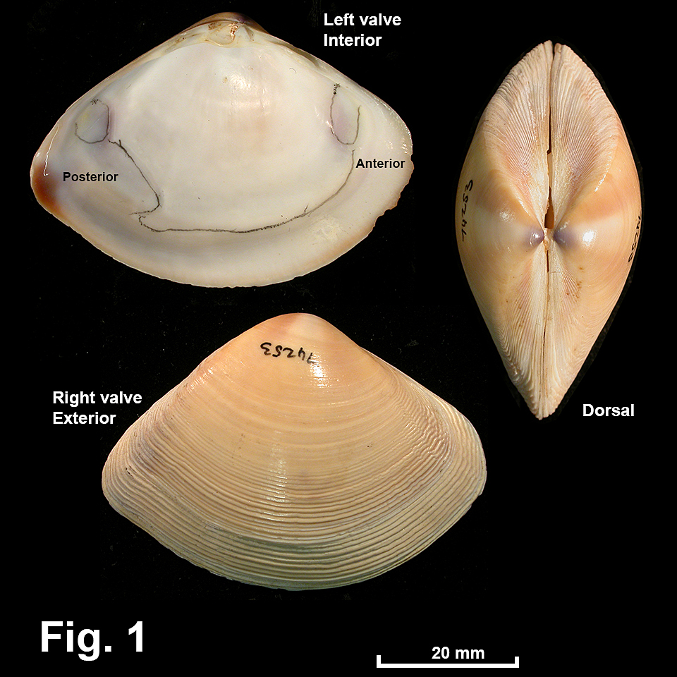 Austromactra rufescens (Lamarck, 1818) Description: Shell lightweight when juvenile, solid and heavily when adult. Shape elongate, postero-dorsal slope straight, antero-dorsal slope weakly concave, ventral margin rounded anteriorly, angled posteriorly. Exterior smooth dorsally, developing strong irregular commarginal ribs ventrally; these ribs wavy at extremities. Interior with pallial line and muscle scars well defined, margin smooth; interior callus thickening with age, initially thin and mainly purple, becoming thick and mainly white with maturity. Hinge as for family. Ligament internal. Shell fawn or pale brown, umbo purple with central radial white streak. Size: Up to 67 mm in length. Distribution: Endemic to Australia: Yeppoon, Qld, southwards and around southern Australia, to southwestern WA, including Tas. Cotton (1961) extended the range in WA as far north as Shark Bay. Habitat: Lives in sand and sandy mud in the shallow subtidal zone of ocean beaches. Often washed up on beaches. Common. Synonymy: Over the wide range of this species from Western Australia to Queensland there is variation in the strength of the sculpture and in shell shape. Shells from NSW were considered to be flatter and more elongate than those from further south, and were called Mactra contraria Reeve, 1854. Particularly elongate shells from southern Queensland were named Austromactra caloundra Iredale, 1930. Remarks: This species changes character with growth from juvenile to adult. When juvenile, the shell is lightweight, with the interior splashed with purple. However, as they grow shells develop a callus internally, with adults being moderately heavy with the interior callus thick and white. Fig. 1: Hyams Beach, Jervis Bay, NSW (C.074253) |