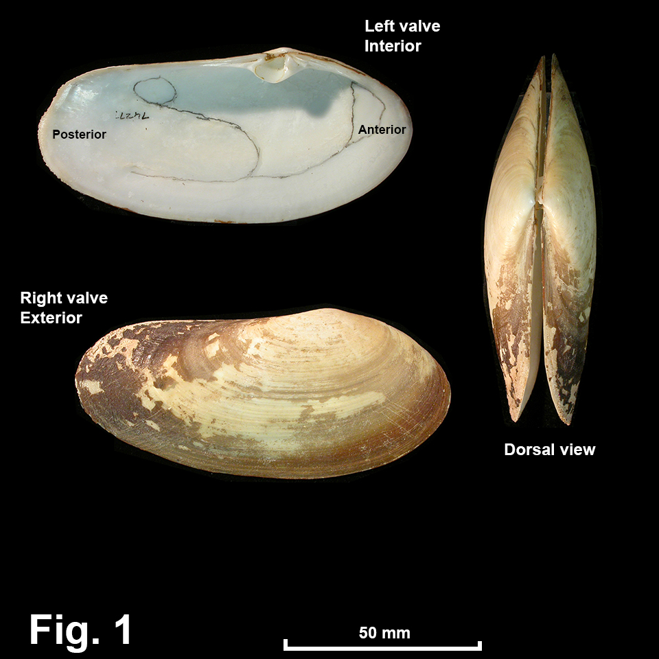 Lutraria rhynchaena Jonas, 1844 Description: Shape very elongate, nearly lanceolate; length about twice the height, umbo at anterior third; gaping at both ends. Exterior smooth apart from irregular growth lines. Interior white, smooth, muscle scars well-defined, pallial sinus large, extending to midline. Hinge as for family. Ligament internal, seated in a large resilifer. Shell white. Periostracum dark brown, thin, smooth. Size: Up to 120 mm in length. Distribution: Endemic to Australia: Keppel Bay, Qld, southwards and around southern Australia, to Carnarvon, WA, including Tas. Habitat: Low intertidal on sand flats and down to at least 50 m. Common. Cotton (1961) said, about this species in South Australia “Burrows deeply in sandy mud, beyond the lowest of tide marks, the siphons reaching up to the surface, the only evidence of their presence being an occasional squirt of water from the exhalent siphon”. Fig. 1: Gunnamatta Bay, Port Hacking, NSW (C.74277)