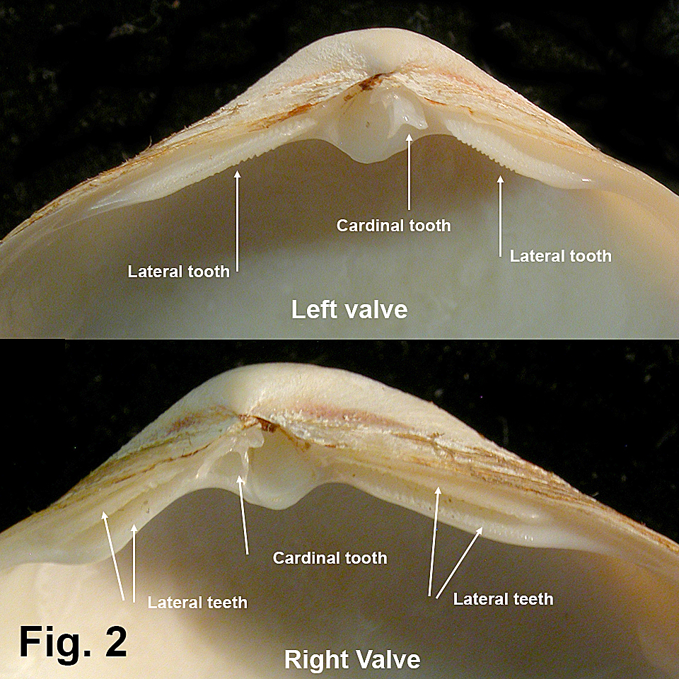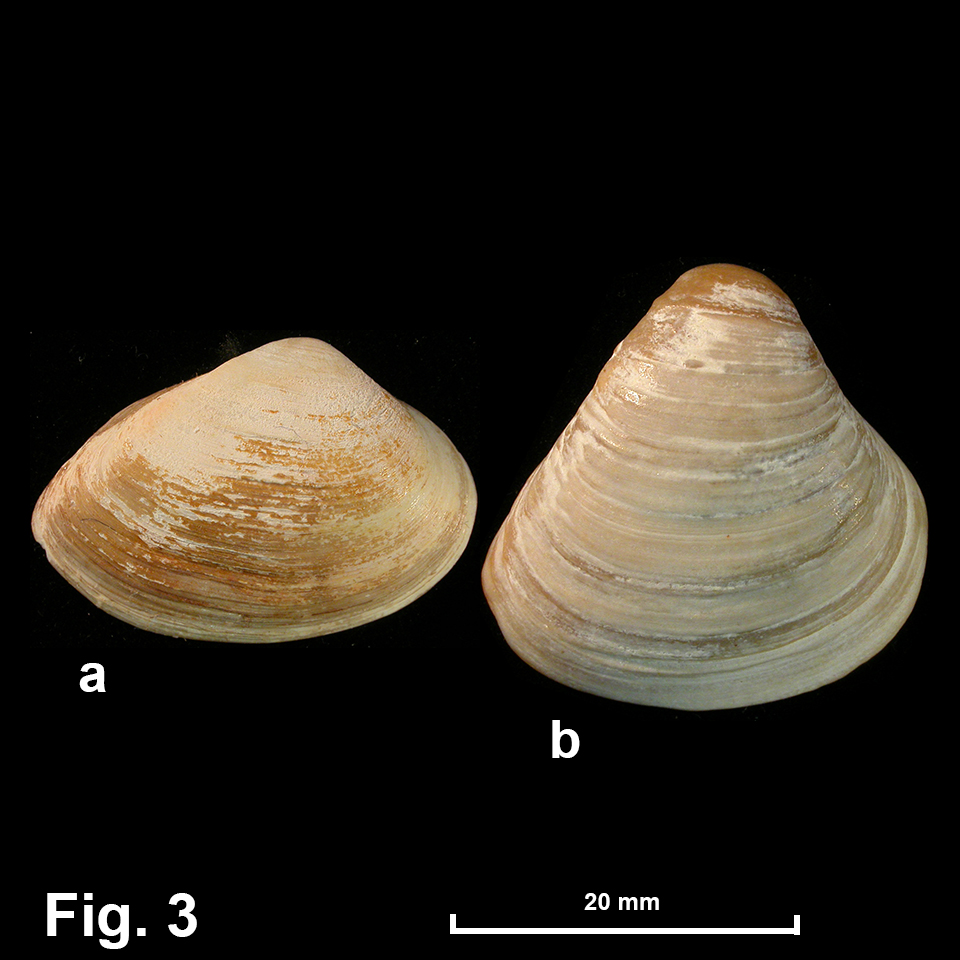 Spisula trigonella (Lamarck, 1818) Description: Shape extremely variable (as shown in Figs 1-3), some shells much longer than high (Fig. 1) whereas others are almost equal in length to height (Fig. 3). Umbo in front of midline ; ridge from umbo to postero-dorsal margin. Exterior usually eroded, sculptured only with commarginal growth lines. Interior white, muscle scars and pallial line distinct; pallial sinus shallow. Hinge (Fig. 2) Same plan as the family, but lateral teeth strongly ridged (a character of the genus Spisula). Ligament internal. Shell white, with eroded brown periostracum. Size: Up to 30 mm in length. Distribution: This species is presently considered to occur around the entire Australian coastline. It has long been recognised as common in southern Australia, but shells exactly matching southern S. trigonella (but consistently smaller) are now recognised as common in parts of northern Australia (R. Willan, pers. comm). It is a relatively recent introduction to southwestern WA, being documented as newly occurring in the Swan Estuary, Perth, by Wilson & Kendrick (1968). Genetic research is required to clarify the distribution and could reveal a species complex. Habitat: Lives burrowing in sand or mud in sheltered coastal waters and lower and middle reaches of estuaries. Synonymy: The large variation in shape has resulted in many synonyms, which are well documented elsewhere (ALA, WoRMS). Of these, the most recently used of the 19th century synonyms in NSW literature are Gnathodon parvum Petit, 1853 and Spisula cretacea Angas, 1867. More recently, Spisula colganae Healy & Lamprell, 1992 was described from the Gulf of Carpentaria, but is considered a synonym of S. trigonella by WoRMS on the assumption that S. trigonella has a pan-Australian distribution. Remarks: The life history and population biology of this species in the Hawkesbury River, NSW, was described by Jones & Murray (1988). The animal occurred living in situations of full marine salinity and upstream to salinity of 12%. Spawning usually occurred between August and November, and growth rates were highest over summer, between November and February. Fig. 1: Iron Cove Creek, Port Jackson (C.083298) Fig. 2: Hinge detail Fig. 3: a. Iron Cove Creek, Port Jackson (C.083298) b. Graving Dock, Wooloomooloo, Sydney (C.314885) |