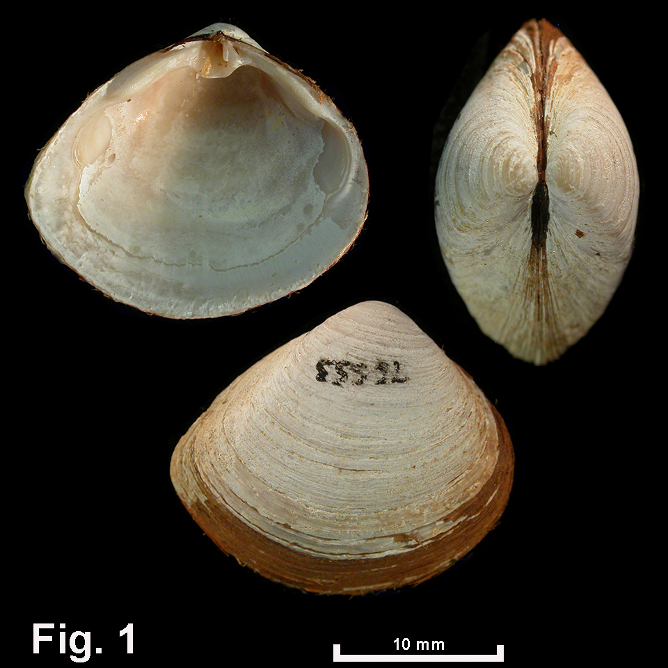 Anapella cycladea (Lamarck, 1818) Description: Shell solid and heavy. Shape umbo forward of midline; posterodorsal slope convex, longer than antero-dorsal slope; angle from umbo to postero-ventral margin. Exterior irregularly covered with fine commarginal threads. Interior smooth, muscle scars and pallial line clearly defined, pallial sinus absent. Margin smooth. Hinge strong, as for family. Ligament internal, attached in deep socket (chondrophore) below umbo. Shell dirty white externally, white internally. Periostracum thick, brown, restricted to ventral margin. Size: Up to 35 mm in length. Distribution: Endemic to Australia: Narooma, NSW, southwards and around southern Australia to south-western WA, including Tas. Habitat: Common in estuaries and on mud flats. Comparison: This species is similar to Spisula trigonella, but lacks the serrations on the lateral teeth and lacks a pallial sinus in the pallial line. Fig. 1: Moulting Lagoon, N. end of Oyster Bay, Tas (C.192149) |