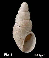 Pepta simplex (Laseron, 1955) Description: Protoconch consisting of two convex whorls, fine microscopic axial threads faintly visible. Teleoconch of three convex whorls, with spiral and axial sculpture. Axial sculpture of very weak broad axial ribs, 10 per whorl. Spiral sculpture of strong ribs, 15 on body whorl. Aperture widely rounded; outer lip with sinus at top.. Umbilicus absent. Columella without plaits. Colour off-white. Size: Holotype 3.9 mm in length. Distribution: Known only from holotype: off Point Halliday, NSW, in 14-18 metres. Habitat: Subtidal; 14-18 metres. Comparison: When describing this species, Laseron stated that it differed from Pepta stricta "by the weaker axial and stronger more rounded spiral cords, by the absence of a fold on the columella, and of course by the sinus in the outer margin". This sinus is not visible in Fig. 1, but is shown in the figure accompanying Laseron's original description. Fig. 1,2 HOLOTYPE Off Point Haliday, NSW, in 14-18 m (C.103626) |
