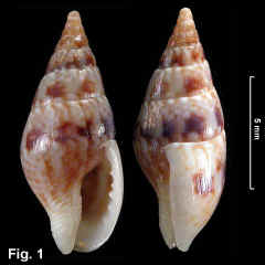 Mitrella tenuis (Gaskoin, 1852) Description: Shell average width for the genus, spire straight sided, whorls rounded, aperture about 1/3 of shell length; protoconch of 1¼ smooth whorls. Spiral sculpture of cords on base; axial sculpture absent. Outer lip sinuous in profile, with shallow sinus; lip thickened externally; thickened internally, with 5-8 denticles. Columella callus sharp-edged in mature shells, axial ridge inside edge bearing several denticles. Siphonal canal very short. Colour variable but several predominant patterns; (a) dark brown with white base (b) axial brown flames or spiral band of brown patches (c) white spots in quincunx (d) any combination of these patterns; base usually white. Interior white or fawn. Periostracum smooth. Size: Up to 16 mm in length. Distribution: Endemic to Australia; Jervis Bay, NSW, around southern Australia to south-western WA. Also some records of doubtful identification from Sydney. Habitat: Intertidal on rocky shores. Comparison: This species is identified by its moderate size, rounded whorls and specific colour patterns. It usually has a white base, but this is a character sometimes seen in other species, particularly M. semiconvexa. It is close to M. semiconvexa but smaller, and many specimens are impossible to positively separate. It is larger than M. leucostoma and of similar shape, and again positive separation is not always possible. Synonymy: There are three synonyms based on colour forms; Columbella pulla Gaskoin, 1852 is based on a uniformly dark brown shell with white on the columella and the edge of the outer lip (Fig. 2); Columbella saccharata Reeve, 1859 is based on a pink shell with white columella; Columbella nux Reeve, 1859 is based on a "worn and monochrome specimen". Fig. 1: Victorian coast (C.209737) Fig. 2: Huskisson, Jervis bay, NSW (C.163611) Fig. 3: Variation |