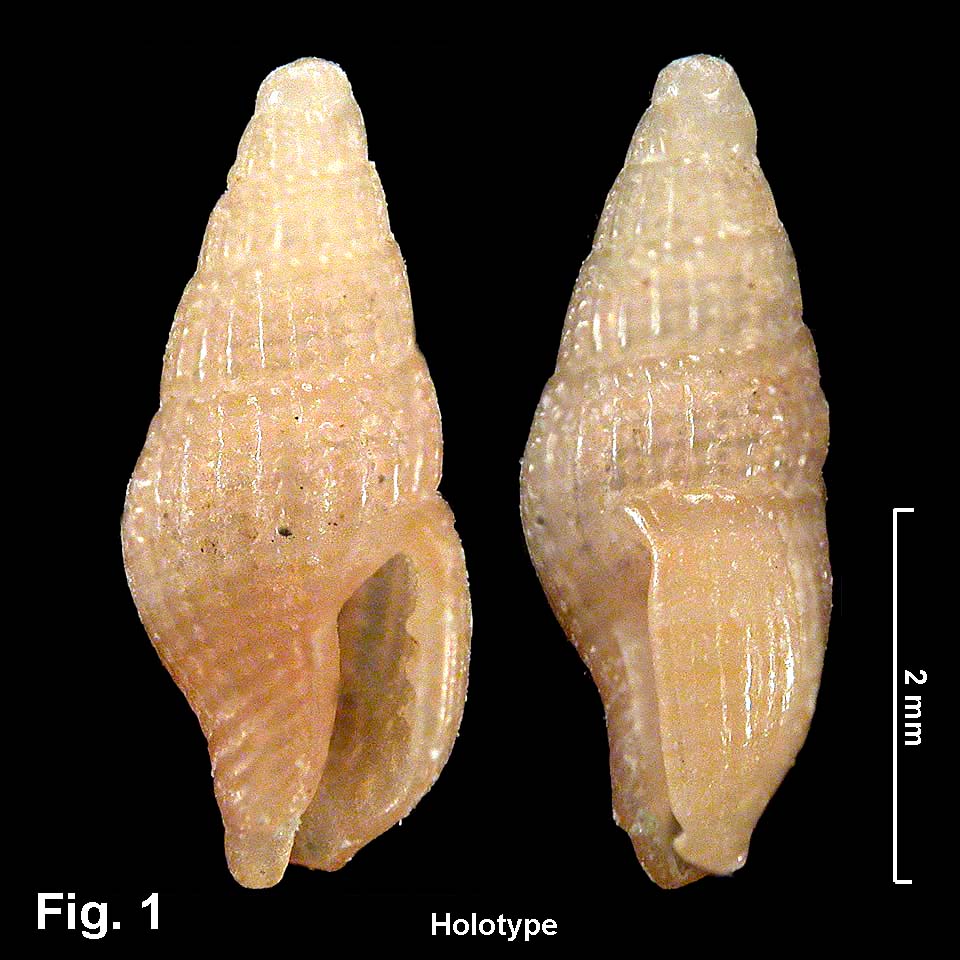 Retizafra plexa (Hedley, 1902) Description: Shell translucent, fawn, whorls rounded, aperture more than 1/3 of shell length. Sculptured with axial ribs, about 20 on the body whorl, fading out towards base, crossed by fine spiral cords, weaker but of about same spacing, creating weak beads at intersections on strongly sculptured specimens; base with about 10 spiral cords. Outer lip sinuous in profile, with shallow sinus posteriorly. Lip thickened externally, and internally with 3-5 denticles, sometimes poorly developed. Columellar callus sharp edged, smooth. Siphonal canal slightly upturned, notch moderately deep. Colour fawn or white, with spiral bands of either colour. Size: Up to 5 mm in length. Distribution: Endemic to Australia; central NSW, but see remarks below. Habitat: Sorted from beach shell grit. Rare. Comparison: Retizafra multicostata (May, 1911) is larger, with finer spiral cords. Remarks: The holotype of this species (Fig. 1) is a beach collected shell from Lady Bay, just inside the southern Headland of Sydney Harbour. In the Australian Museum collection there are only six specimens positively identified as this species; five are beach collected between Long Reef, Collaroy, NSW, and Ulladulla, NSW, and one is from 9 m in Sydney Harbour. However, there are several lots from central NSW in depths of 146-183 m which appears to be the same species, and a further lot from 200 m deep in South Australia. But it is difficult to reconcile the depth of these specimens with the beach collected type. The specimen figured by Wilson (1994, p. 108) under this name is not this species, but is probably an undescribed species. Fig. 1: HOLOTYPE. Lady Bay, South Head, Sydney. Beach. (C.011441). Fig. 2: Kurnell, Botany Bay, NSW (C.335122) |