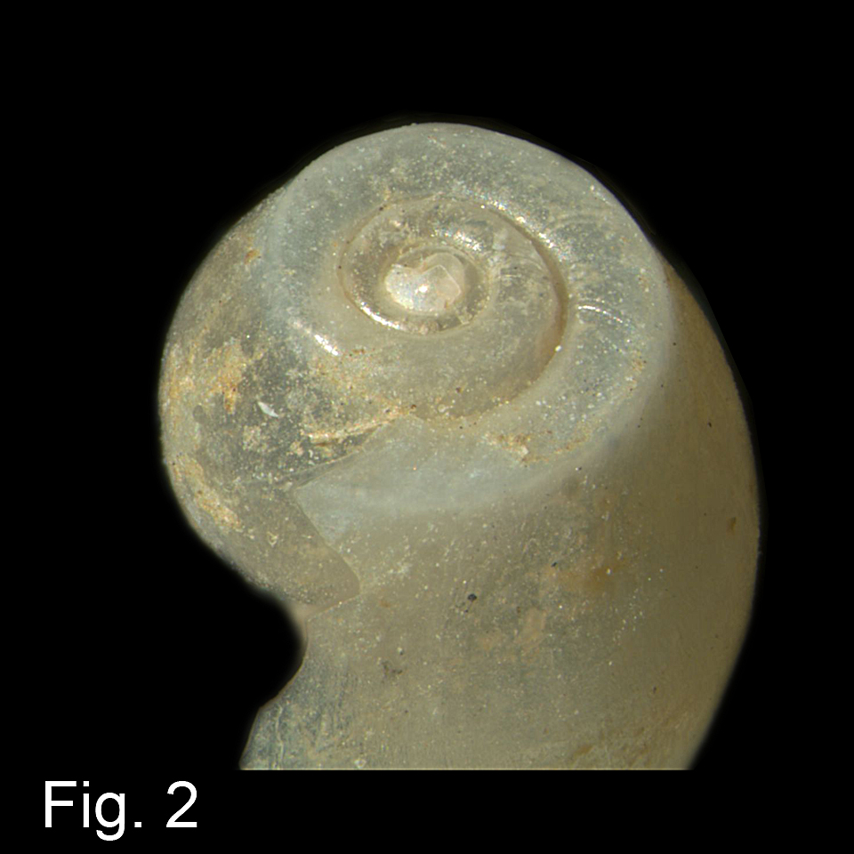 Diaphana brazieri Angas, 1877 Description: Shell small or minute, lightweight, apex truncate. Spire flat, or slightly elevated, or depressed with projecting protoconch; top of whorls on spire rounded, deeply grooved between whorls; last whorl shouldered. Whorls smooth below shoulder apart from weak growth lines. Aperture broad, with wide canal anteriorly, outer lip thin. Columella smooth, slightly expanded over deep umbilicus. Shell colourless transparent to opaque white. Size: Up to 4.5 mm in length. Distribution: Australian Museum specimens are from off Tweed Heads, NSW, southwards to Bass Strait. Burn (2006) reported it from all Australian states and New Zealand. Habitat: Australian Museum specimens are from 9 m in Sydney Harbour down to 1600 m off Tweed Heads. Fig. 1: Off Sow and Pigs Reef, Port Jackson, NSW, in 7 m (C.64665 LECTOTYPE). (Photo Australian Museum). Fig. 2: Spire detail. Off Sow and Pigs Reef, Port Jackson, NSW (C.008000). |