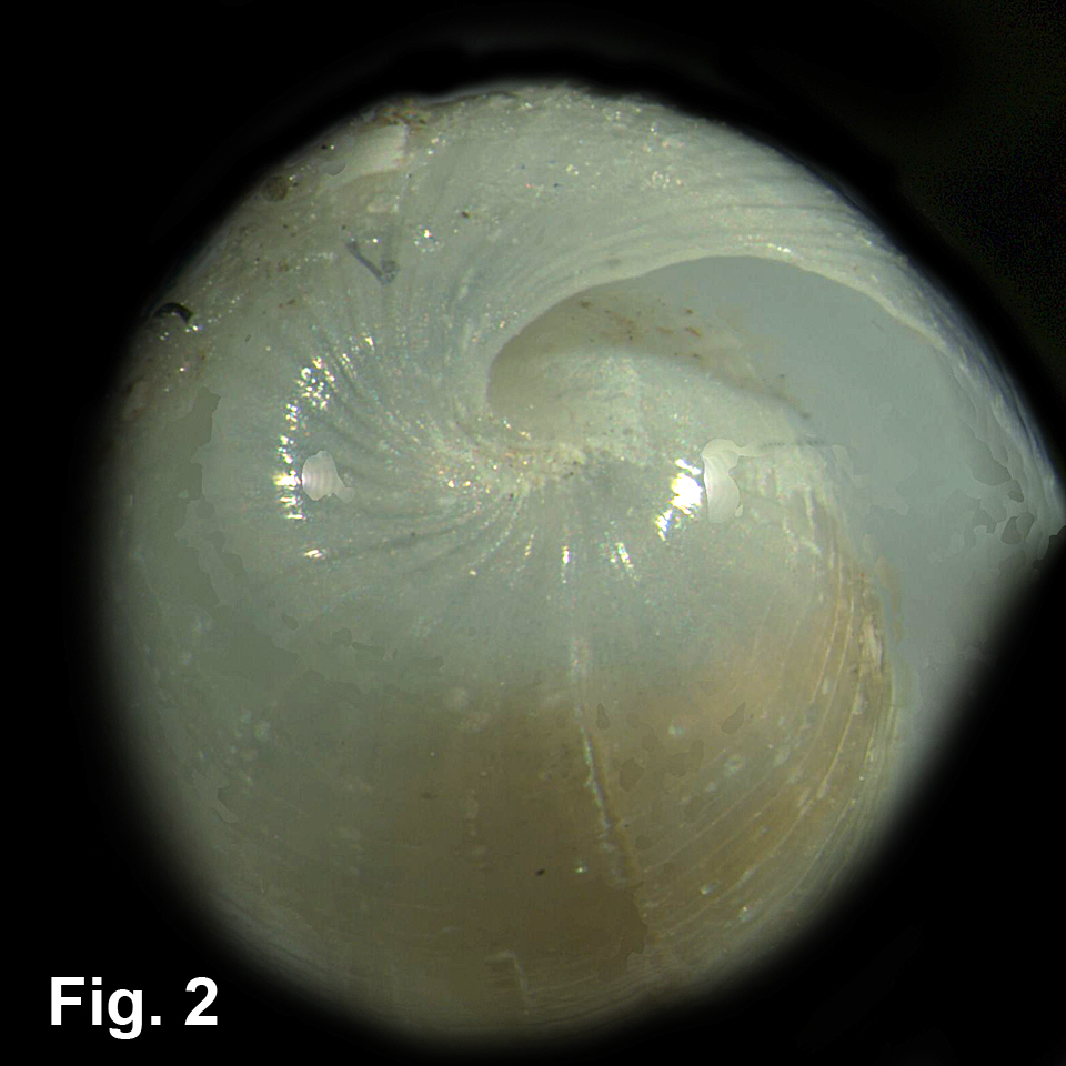 Cylichnatys campanula Burn, 1978 Description: Shell thin, elongate, involute, width about 50% of shell length. Apex slightly sunken, not umbilicate. Last whorl with sides parallel or weakly constricted over middle part of shell. Aperture narrow over top half, wide at bottom; outer edge sharp. Columella smooth, curved, parietal wall with thin callus. Whole surface smooth or with coarse axial growth lines, and sometimes widely-spaced spiral groves. Shell translucent when fresh, becoming opaque white with age. Size: Up to 4 mm in length. Distribution: Endemic to Australia: Port Stephens, NSW, southwards and around southern Australia to the Swan River estuary, southwestern WA. Habitat: Lives in the intertidal and down to 18 m in estuaries, in seagrass and on mud. Common. Comparison: This is like Retusa atkinsoni, but has no apical umbilicus. Remarks: Burn (1978) gave a description of the genus Cylichnatys and of his new species in which he stressed that the spiral sculpture was a prominent character. But only a small proportion of the NSW specimens I have examined show such spiral sculpture. Perhaps it is prominent in live taken specimens, but in dead shells it is not apparent, even in specimens which do not appear to be worn. Burn (1978) gave the variation in shell width as 30-60% of shell height, but the variation is not as large in NSW specimens. For the shells in Fig. 1 the ratio is 50%, which is typical of NSW specimens. Fig. 1: a. and b. Cronulla Beach, Sydney, NSW (C.395014). Fig. 2: Apex of Fig. 1 specimen a (C395014). |
