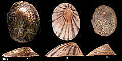 Notoacmea flammea (Quoy & Gaimard, 1834) Description: Shell lightweight, low to medium in height, posterior slope convex, anterior slope slightly concave; widest centrally or posteriorly; apex slightly to markedly in front of centre. External sculpture of about 50-100 microscopic, widely spaced radial threads, sometimes nodulose and occasionally superimposed on broad, low radial folds. External colour variable; background of cream, fawn, dark green or black, with a superimposed pattern of rays or reticulate dots. Interior colouration similarly variable; adult shells with dark spatula, black or brown margin and blue-white zone between; juveniles with external colouration showing through. Size: Up to 24 mm in length, commonly 10-15 mm. Distribution: Endemic to Australia: Sydney, NSW, to Perth, WA, including Tasmania. Habitat: On protected rocky shores in the lower littoral, often on the sides of or under boulders. Uncommon in NSW, common in southern Australia. Comparison: Readily separated from the other NSW limpets by the microscopic radial threads. Synonymy: Acmaea scabrilirata Angas, 1865; Acmaea subundulata Angas, 1865; Notoacmea flammea diminuta Iredale, 1924 Remarks: The fine radial threads are seen only with magnification. They are only seen on un-corroded shells, which are a minority of the population. Fig. 1 Bottle and Glass Rocks, Sydney Harbour, NSW (C.049539) Fig. 2 a. Sydney Harbour, NSW (C.049539) b. Cape Sorell, Tasmania (C.424258) c. Between Burnie and Stanley, Tasmania (C.090689) |