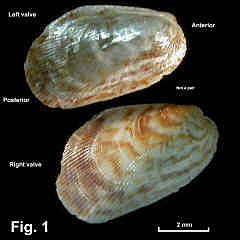 Musculus varicosus (Gould, 1861) Description: Shell equivalve, inequilateral, elongate, light in weight, inflated; umbo behind anterior end, incurved, projecting above dorsal margin. Valves twice as long as wide, wider posteriorly. Margin crenulated by external sculpture. Hinge without teeth. Ligament moderately long, almost straight. Interior smooth, muscle scars obscure, surface slightly nacreous. Exterior with 3 sculptural panels; anterior panel with about 10 widely spaced radial ribs, posterior panel finely, densely radially ribbed, central panel with only concentric growth ridges. Colour of exterior white with brown zones, sometimes having zigzag stripes. Interior slightly nacreous, white with brown patches or zigzag zones. Periostracum unknown. Size: Up to 16 m in length, usually less than 8 mm. Distribution: The Australian Museum collection holds specimens only from the Sydney region - from Pittwater southwards to Port Hacking. Habitat: Known only from beach washup. Comparison: This species is smaller than M. impactus, usually much smaller at around 8 mm in length. It is also more elongate. Fig. 1: Sydney, NSW (C.017538) |