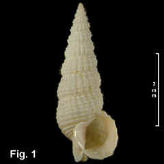 Ataxocerithium serotinum (A. Adams, 1855) Description: Shell moderately narrow, up to 11 teleoconch whorls, spire straight-sided until penultimate whorl. Protoconch of 2¼ whorls, first ½ whorl smooth, rest with strong axial folds. Teleoconch whorls convex, either uniformly rounded or angled at lower third. Sculpture variable; axial folds weak or strong, sometimes thickening towards bottom of whorl; spiral cords 5 or 6 per whorl, weak or strong, crossing axials to form beads at intersections. Last whorl with about 5 spirals on base. Last whorl expanded over final one-third of whorl. Aperture nearly circular, outer lip flared, thickened internally; inner lip flared; anterior canal relatively long, tubular and deep. Shell, including protoconch, translucent, uniformly fawn or irregularly marked with light brown, becoming opaque with age, with thin periostracum, usually worn away. Size: Up to 16 mm in length. Distribution: Endemic to Australia: Maroochydore, Qld, southwards and around southern Australia, including Tasmania, and northwards in WA to North West Cape. Habitat: Empty shells from beach washup and down to 100 m. Live specimens from 2–20 m in association with sponges. Synonym: Previously recognised synonyms are Ataxocerithium conturbatum Iredale, 1936; Ataxocerithium scruposum Iredale, 1936; Cerithium rhodostoma A. Adams, 1855. Remarks: The sculpture of this species is very variable; axial folds may be weak or strong, spirals may be weak or strong, and whorls may be rounded or angled. Fig. 3 shows 3 specimens from the same locality near Woolgoolga showing such variation. Fig. 4 shows the holotype of Ataxocerithium gemmulatum Woolacott, 1957 which has sculpture similar to the specimen on the right in Fig. 3; it may be a further synonym, although the shell is unusually wide and the whorls flatter than usual for A. serotinum. Fig. 1: Off North Head, Sydney, NSW, 20 m, associated with sponges (C.366963) Fig. 2: Off Kurnell, Botany Bay, NSW 12 m on sponge (C.315643) Fig. 3: Mullaway Headland, north of Woolgoolga, NSW (C.244565) Fig. 4: Gerringong, NSW (C.102801 Holotype of Ataxocerithium gemmulatum) |