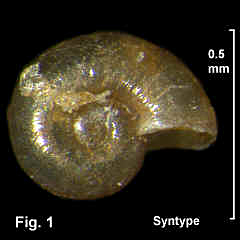 Omalogyra liliputia (Laseron, 1954) Description: Shell minute, almost planar, spire sunken. Protoconch plus teleoconch up to 2¼ whorls. Whorls circular in cross section, smooth or with growth lines encircling whorls; suture deep. Ventral surface of shell of similar shape and sculpture to dorsal surface. Aperture circular, lip expanded in mature shells. Shell translucent dark brown, margin of aperture sometimes white in mature shells. Size: Figured syntype 0.6 mm diameter. Distribution: Laseron (1954) gave the distribution as Port Stephens, NSW southwards to Crookhaven, NSW. The Australian Museum collection holds specimens from Port Stephens, NSW, southwards to Ulladulla, NSW, and lots from Port Lincoln, SA, and Triggs, near Perth, WA. Habitat: Laseron (1954) said "Abundant in various locations in rock pools and in shallow water, mainly living on algae. The type was abundant on the green weed Ulva, at Castle Rock, Middle Harbour, Port Jackson. We also have it from Long Reef, both on seaweed and beneath stones, also on the surface of a sponge from 10 feet, North Harbour, and in mussel beds within the harbour, and from Port Stephens in the north to Crookhaven in the south". Common. Comparison: See Ammonicera sucina. Remarks: Ponder & de Keyzer (1998) gave an SEM photo of one view of the shell of this species, and a drawing of the live animal. Fig. 1–3: Castle Rock, Middle Harbour, NSW (SYNTYPE C.102494) |