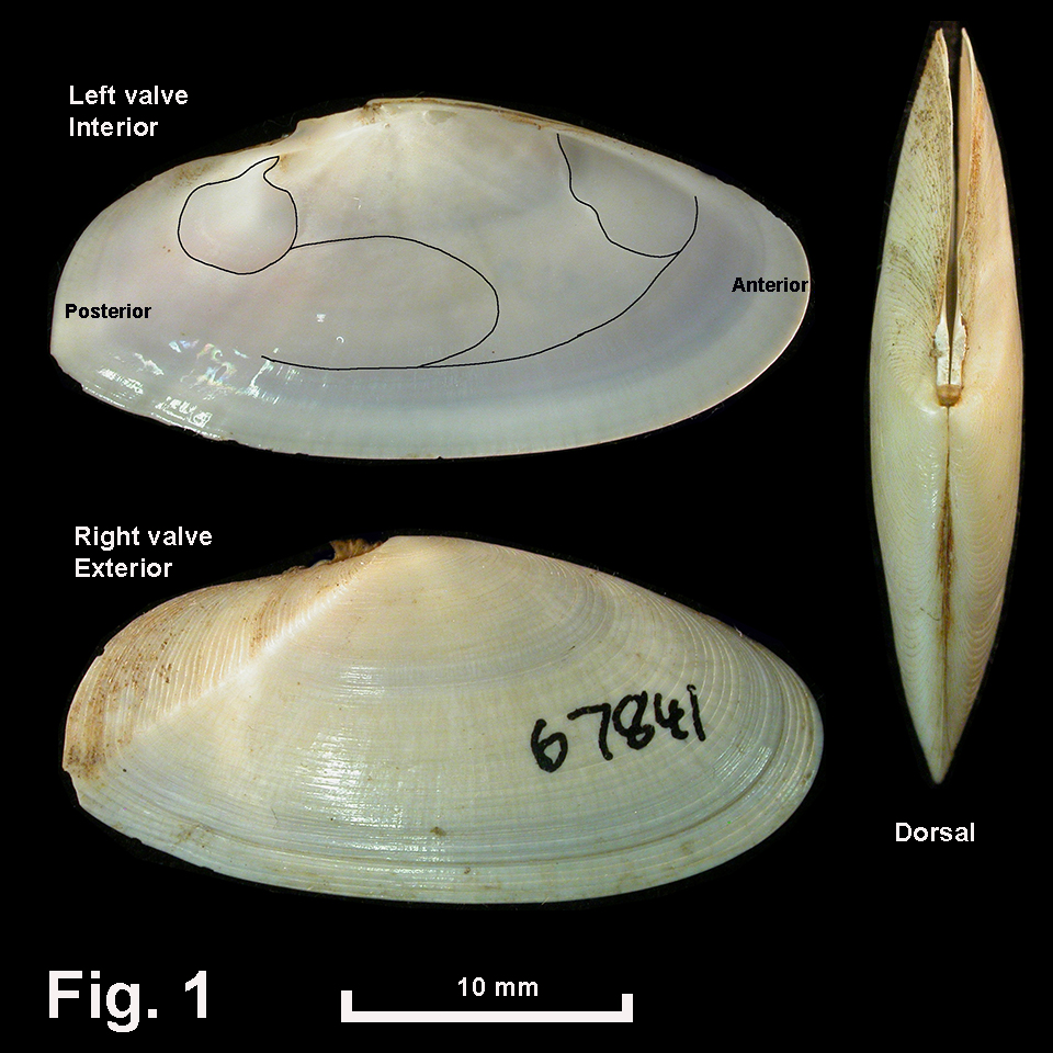 line ventrally. Hinge right valve with 2 cardinal teeth, 1