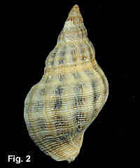 Agnewia tritoniformis (Blainville, 1832) Description: Shell with rounded whorls, with about 11 broad, low axial ribs, crossed by about 40 fine, smooth, spiral riblets, which group together to form 6 or 7 larger spiral ribs, well defined on the posterior of the body whorl, but more diffuse on the anterior. Axial and spiral ribs fawn, the interspaces black, giving a fenestrate appearance. Columella smooth, outer lip toothed in mature shells, interior white, lip sometimes yellow. Operculum corneous. Size: Average length 20 mm, maximum 35 mm. Distribution: Australia and northern New Zealand; in Australia, Caloundra, Qld, to Yorke Peninsula, SA, including Tas. Habitat: Under rocks and in pools on the open coast. Common in NSW. Remarks: Fig. 3 shows a section of the egg mass of this species, deposited on a piece of shell. The egg mass consists of a hundred or so hemispherical, transparent capsules of about 3 mm in diameter, each of which contains hundreds of larval shells. The brown capsules are still filled with larval shells; the colourless capsules have broken open at the top and have emptied. Figs. 1,2: Minnie Waters, NSW (C.346753) Fig. 3: Egg mass (C.403738) |