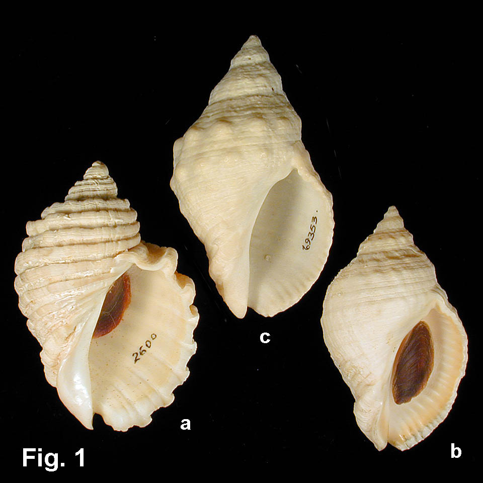 Dicathais orbita (Gmelin, 1791) Description: This species varies widely in sculpture. The eastern Australian shell (Figs. 1a, 2a) usually has strong spiral sculpture; 7 to 9 strong spiral ribs on body whorl, with intervening grooves of about the same width; ribs and grooves with secondary spiral riblets. Anterior fasciole about same size as spiral ribs. Columella smooth; outer lip internally reflects external sculpture. Colour off-white or grey, aperture cream, often pale yellow on the edge. Size: Average length 60 mm, maximum 120 mm. Distribution: In Australia, from Fraser Is., Qld, to North West Cape, WA, including Tasmania. Also New Zealand and Lord Howe Is. Habitat: On rock platforms and rocky shores, in the surf zone, particularly in crevices at low tide and below. Abundant. Synonym: Dicathais vector Thornley, 1952 Remarks: The southern Australian form (Figs. 1b, 2b) is generally much less coarsely sculptured than the eastern form (Figs. 1a, 2a) and has been known as Dicathais textilosa (Lamarck, 1822). The figured specimen of this southern form (Figs. 1b, 2b) from Tasmania has about 25 spiral ribs, and the interior of the lip has about 20 lirae. West Australian specimens (Figs. 1c, 2c) are often nodulose, and have been called D. aegrota (Reeve 1846). Phillips, Campbell and Wilson (1973) examined a large number of specimens of this species from central Queensland to central Western Australia. They concluded that a single variable species exists, with variation in shell shape and sculpture being a function of water temperature, diet, substrate and degree of exposure to wave action. They kept specimens of the NSW orbita form in an aquarium for three years, and found that the new shell growth was no longer coarsely ribbed, but first striated and then smooth. At Rottnest Island, WA, D. orbita is a pedator on another large gastropod, Ninella torquata, normally attaching by drilling at the edge of the operculum of its victim (Taylor & Glover, 1999). Figs. 1a, 2a: Newport, Sydney, NSW (DLB2600) Figs. 1b, 2b: Tasmania (DLB1262) Figs. 1c, 2c: West Wallabi Is., Houtman Abrolhos, WA (C.69353) |