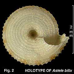 Calliobasis bilix (Hedley, 1905) Description: Shell slightly wider than high, spire outline almost straight. Protoconch of one finely granulate whorl, with well-defined junction to teleoconch. Teleoconch up to 6 whorls. Early spire whorls with two spiral cords, increasing to four on last whorl; last whorl with additional cord just below periphery. Axial sculpture of strong, elevated curved ribs, continuous from whorl to whorl, forming peaks at intersections with spiral cords. Base slightly rounded with 8 spiral cords, weakly beaded at intersections with radial threads. Umbilicus open, edged by strongly toothed cord. Aperture subrhomboidal; outer lip unknown (broken on all available specimens). Colour opaque fawn, holotype with squarish brown patches regularly spaced on periphery of last whorl. Size: Up to 3.2 mm high, 3.6 mm wide. Distribution: Known from five specimens from two lots. Holotype from east of Cape Byron, NSW, in 203 m; 4 specimens from 22 miles east of Narrabeen, NSW, in 146 m. Habitat: Known from 146-203 m. Rare. Synonymy: This species has previously been considered to be a variety of the Eocene fossil Basilissa radialis Tate, 1890, and, by other authors, a synonym of the South Australian species Basilissa bombax Cotton & Godfrey, 1938. However, Marshall (1983), when erecting the genus Calliobasis, regarded these three taxa as separate species - C. radialis (Tate. 1890), C. bilix (Hedley, 1905), C. bombax (Cotton & Godfrey, 1938). Figs. 1,2: 4786-1, 4787-1 HOLOTYPE 12.4 miles SE Cape Byron, NSW, in 203 m (C.019840) |