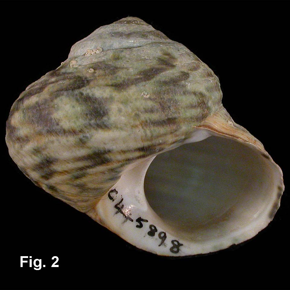 Turbo (Subninella) undulatus Solander, 1786 Description: Shell solid, wider than high, with spirally ribbed, rounded whorls covered with a thin, brown periostracum. Aperture circular, outer lip thin, simple. Umbilicus widely open, columella smooth. Operculum calcareous, circular, internally flat and brown, externally white with marginal flange and central dome. Exterior colouration of zigzag axial streaks of white and dark green; interior nacreous; umbilical area and columella white. Size: Up to 61 mm wide, 57 mm high. Distribution: Endemic to Australia: Coolangatta, Queensland, to Bremer Bay (east of Albany), WA, including Tasmania. Habitat: On exposed and semi-sheltered rocky shores, among algae and in crevices, at mid-tide level and below. Common. Synonymy: The spiral ribbing of this species is variable in strength. Some West Australian and Tasmanian shells are almost completely smooth, but NSW shells are usually ribbed, the ribbing being stronger on specimens from northern NSW. The strongly ribbed eastern Australian form has been referred to as Subninella anguis (Gmelin, 1791), but as there is a continuous gradation from smooth to heavy ribbing it does not justify separation. Remarks: Living specimens usually have the colour obscured by the brown periostracum, but it is thin and flaky and rapidly wears off dead shells. Fig. 1: Kurnell, Botany Bay, NSW (C.150040) Fig. 2: Boat Harbour, Cronulla, NSW (C.445898) |